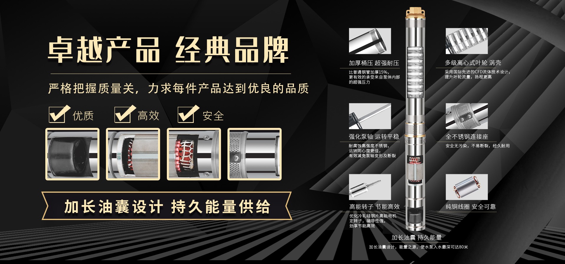公司始終站在深井泵行業的前端位置,科研力量、產品和設備技術水平均達到國內優(yōu)質水平,公司始終堅持走科技興企、自主創新的企業發(fā)展之路,產品不斷推陳出新,可廣泛應用于農業灌溉、生活用水、循環(huán)供暖、污水處理、市政供水、石油化工、冶金礦山等領域。